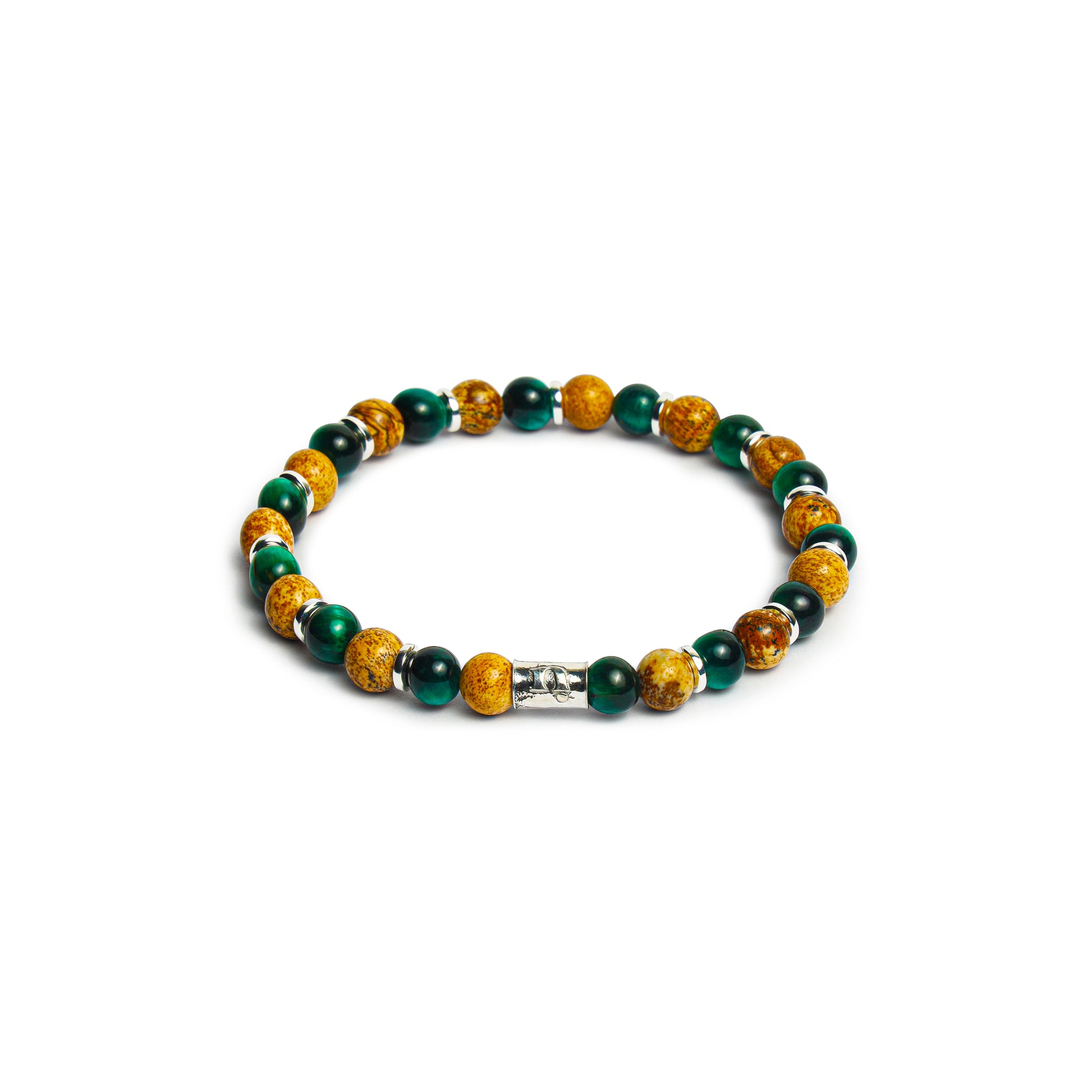 BRACCIALE ELASTICO CON ELEMENTI DI PAESINA, OCCHIO DI TIGRE VERDE DA 6 MM E ARGENTO 925.