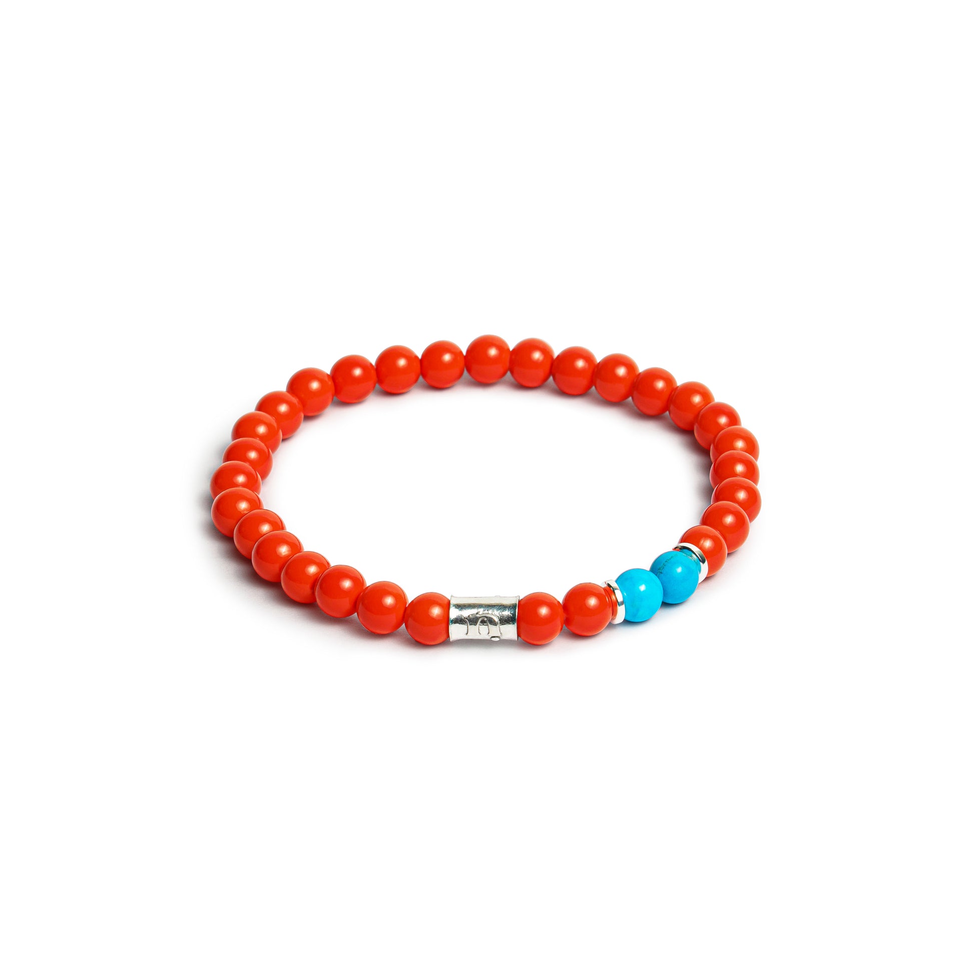 BRACCIALE ELASTICO CON ELEMENTI DI PERLA DI MAIORCA ARANCIONE, HOWLITE BLU DA 6 MM E ARGENTO 925.