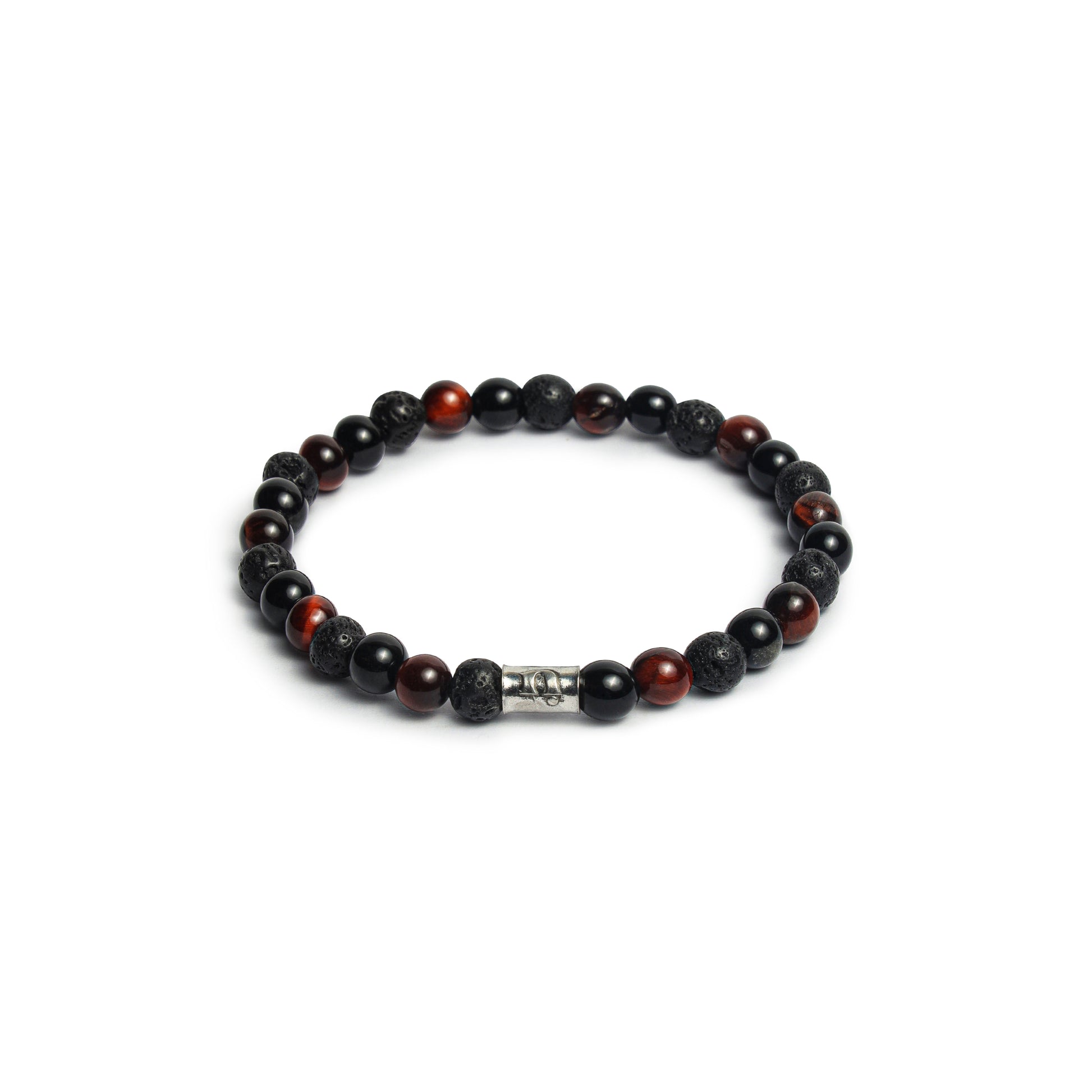 BRACCIALE ELASTICO CON ELEMENTI DI ONICE NERA LUCIDA, PIETRA LAVICA, OCCHIO DI TIGRE ROSSO DA 6 MM E ARGENTO 925.