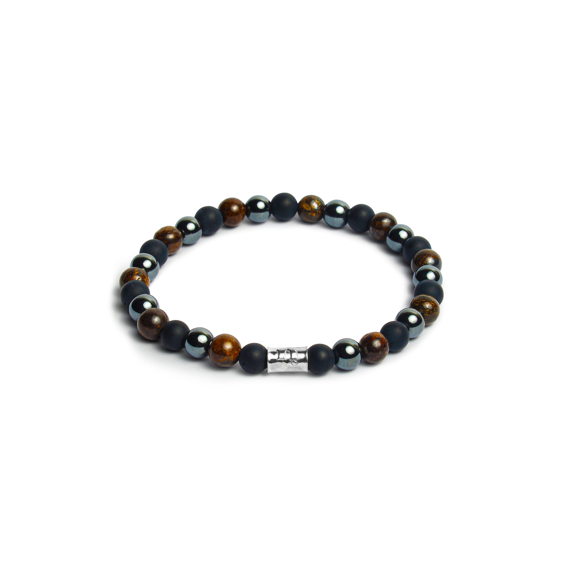 BRACCIALE ELASTICO CON ELEMENTI DI BRONZITE, EMATITE, ONICE NERA OPACA DA 6 MM E ARGENTO 925.