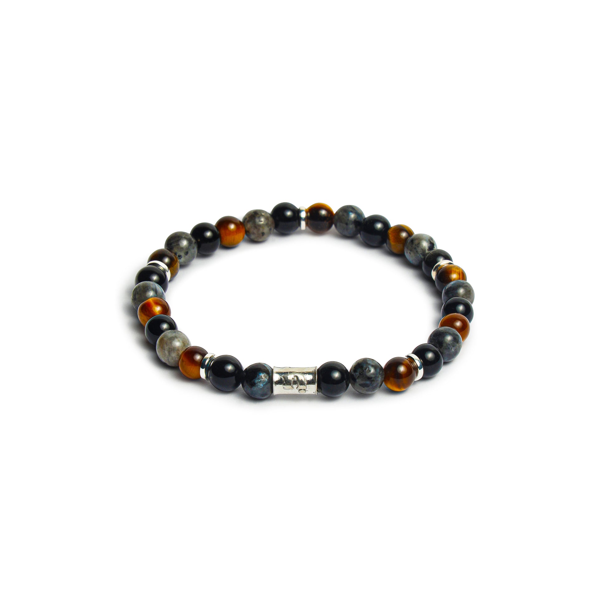 BRACCIALE ELASTICO CON ELEMENTI DI OCCHIO DI TIGRE MARRONE, ONICE NERA LUCIDA, LABRADORITE NERA DA 6 MM E ARGENTO 925.