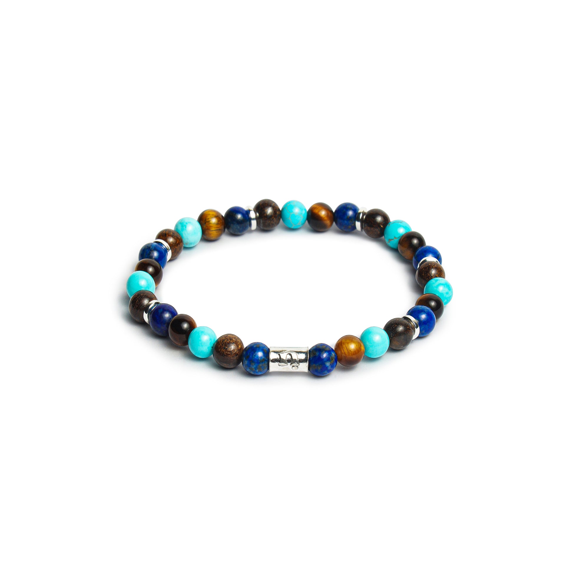 BRACCIALE ELASTICO CON ELEMENTI DI OCCHIO DI TIGRE MARRONE, BRONZITE, LAPIS, HOWLITE AZZURRA DA 6 MM, ARGENTO 925.