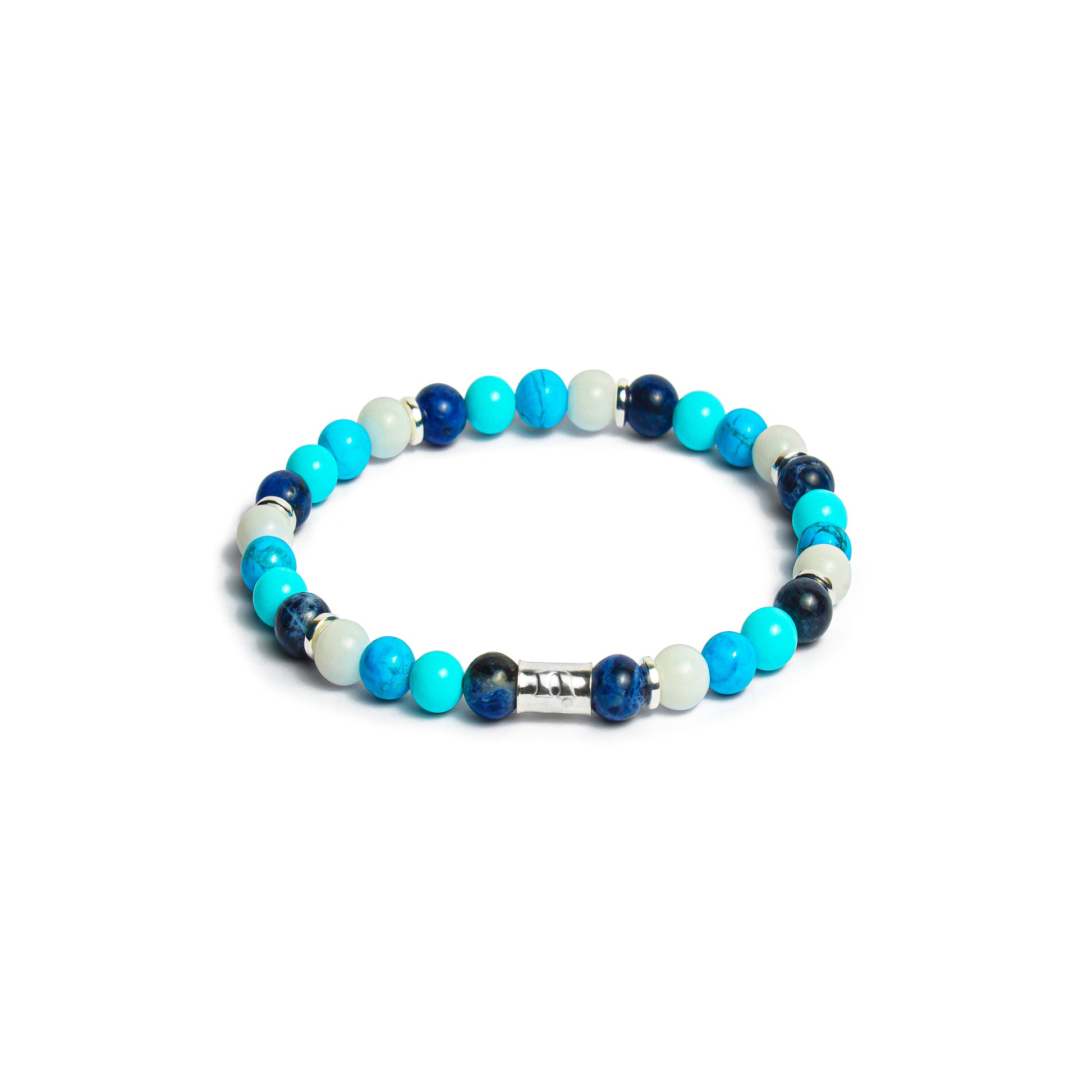 BRACCIALE ELASTICO CON ELEMENTI DI ONICE BIANCA LUCIDA, HOWLITE BLU, PASTA DI TURCHESE AZZURRA, SODALITE DA 6 MM E ARGENTO 925.