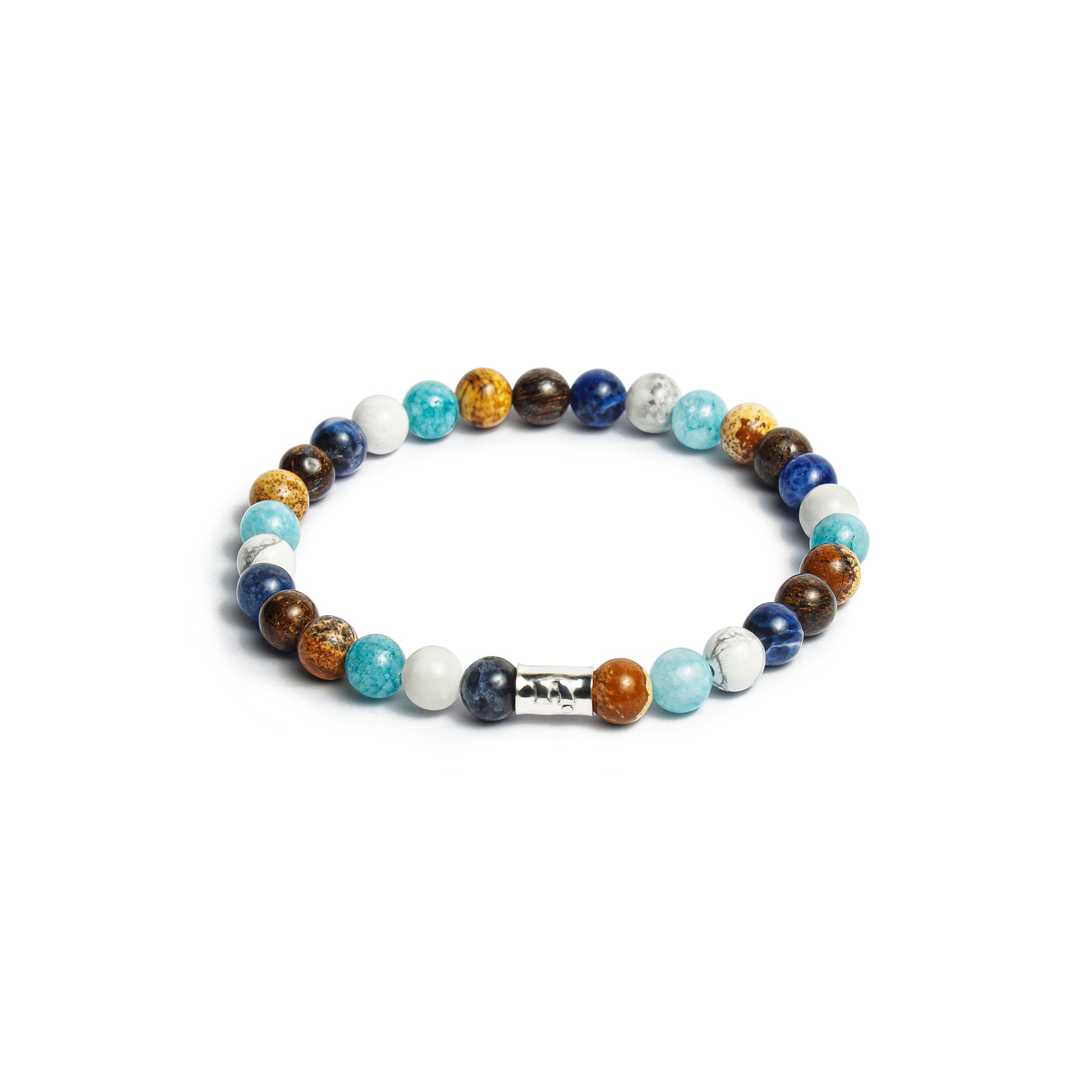 BRACCIALE ELASTICO CON ELEMENTI DI BRONZITE, SODALITE, HOWLITE BIANCA, ANGATA AZZURRA, PAESINA DA 6 MM E ARGENTO 925.