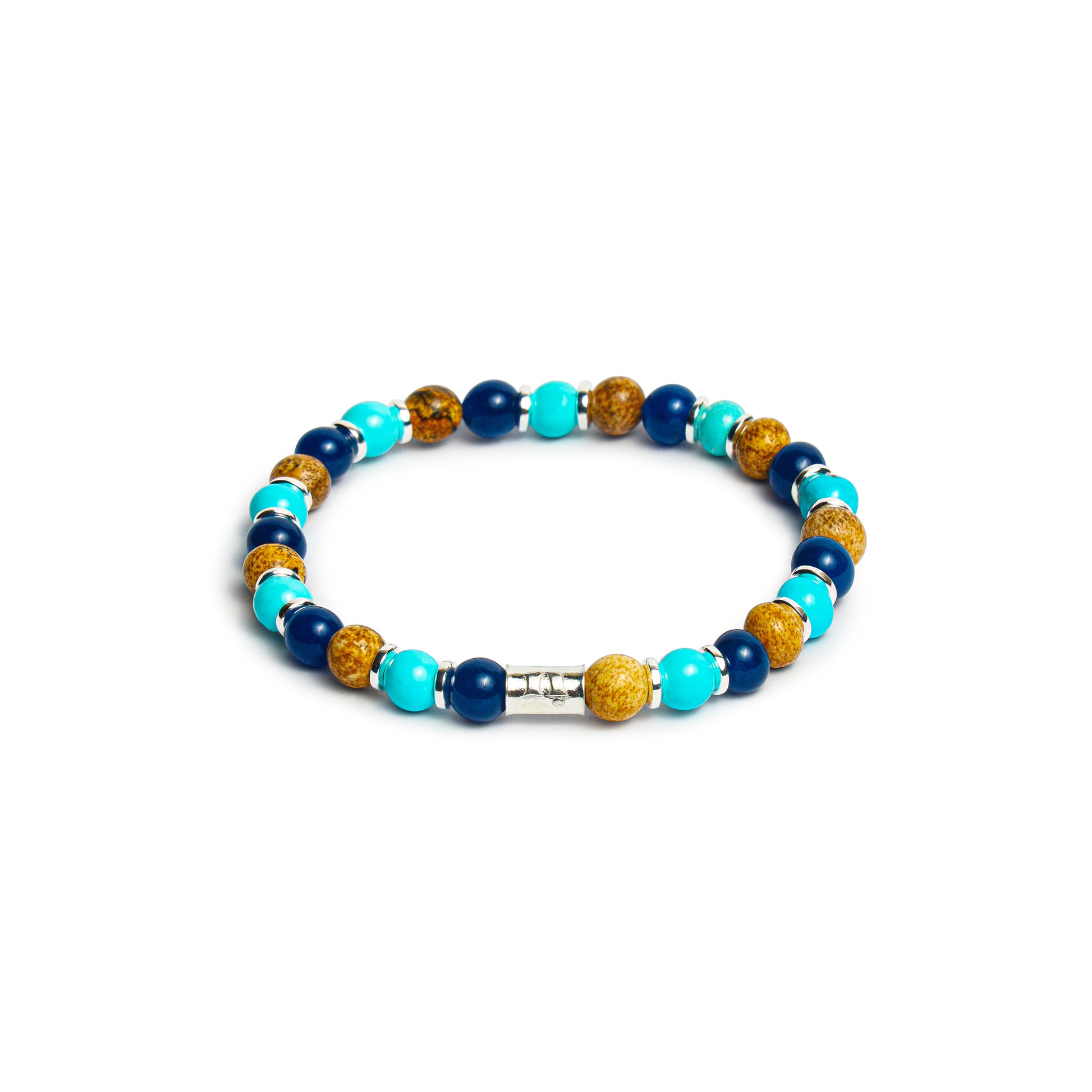 BRACCIALE ELASTICO CON ELEMENTI DI DARK BLUE SPONGE QUARTZ, PAESINA, HOWLITE AZZURRA DA 6 MM E ARGENTO 925.