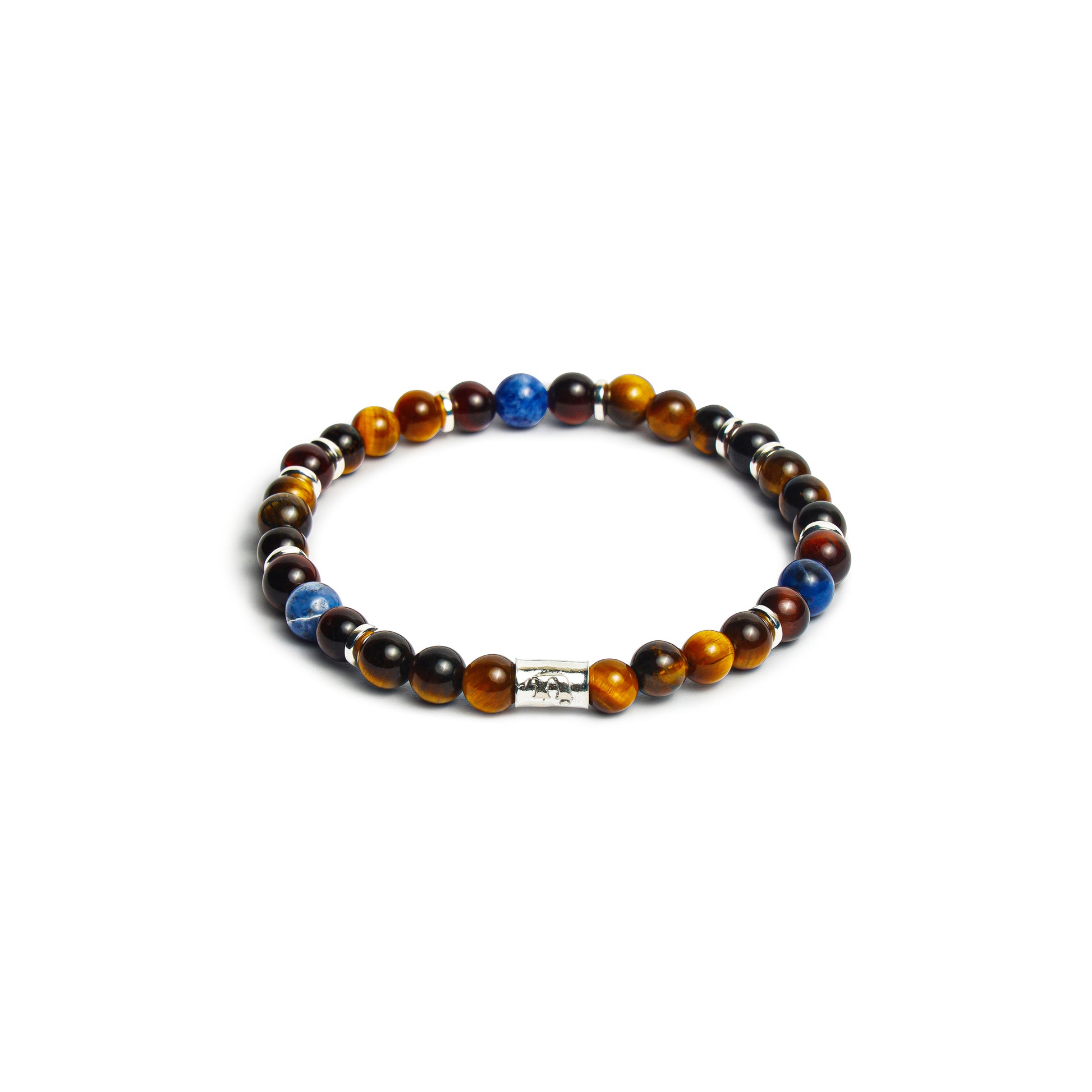 BRACCIALE ELASTICO CON ELEMENTI DI OCCHIO DI TIGRE MARRONE, OCCHIO DI TIGRE ROSSO, SODALITE DA 6 MM E ARGENTO 925.
