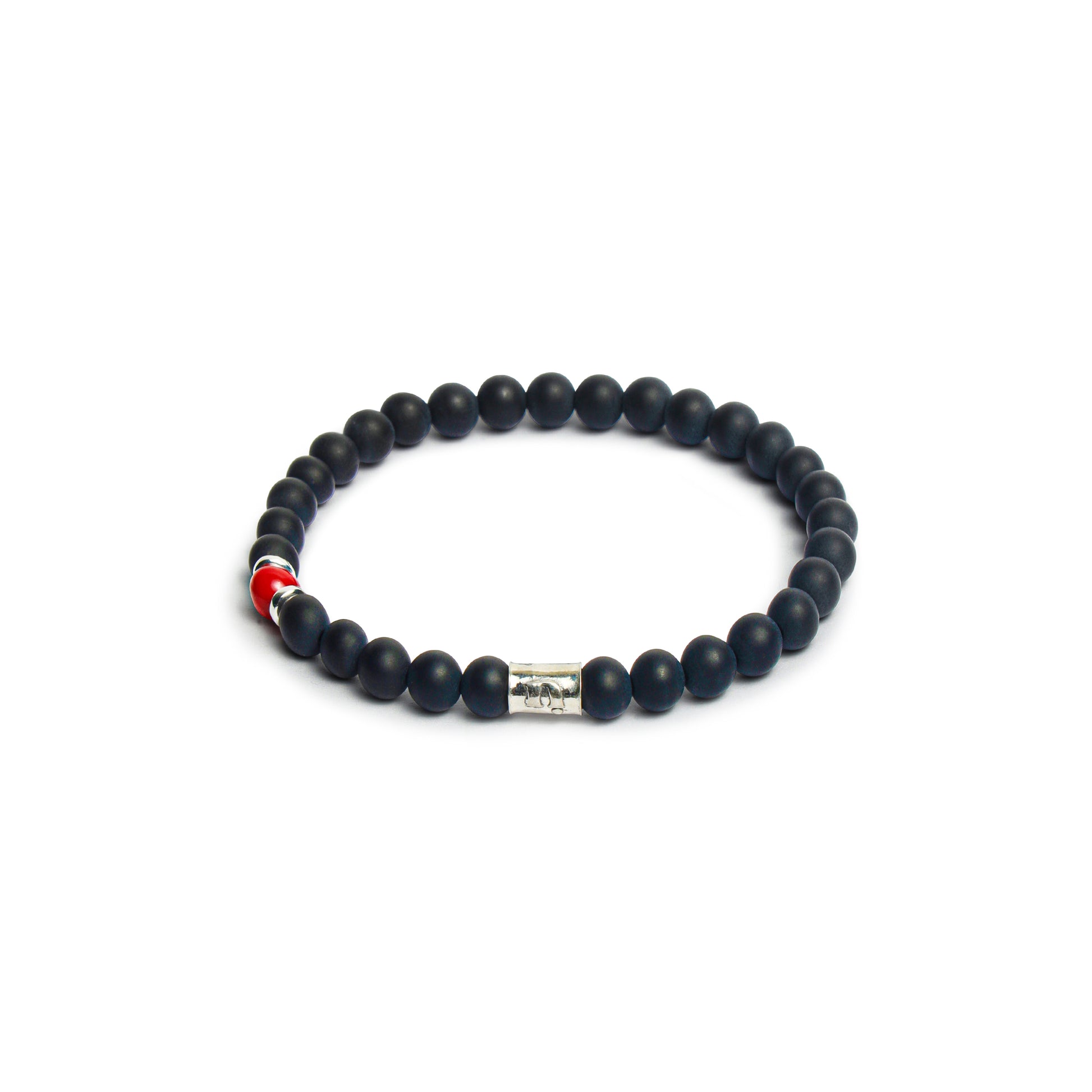 BRACCIALE ELASTICO CON ELEMENTI DI ONICE NERA OPACA, PERLA DI MAIORCA ROSSA DA 6 MM E ARGENTO 925.