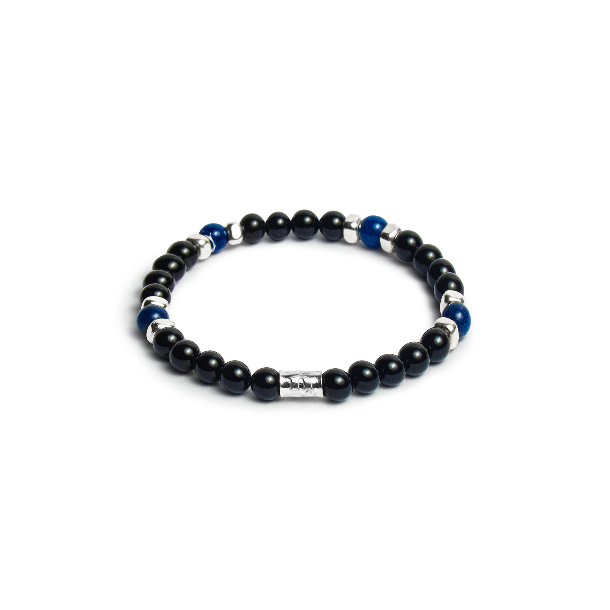 BRACCIALE ELASTICO CON ELEMENTI DI ONICE NERA LUCIDA, DARK BLUE SPONGE QUARTZ DA 6 MM E ARGENTO 925.