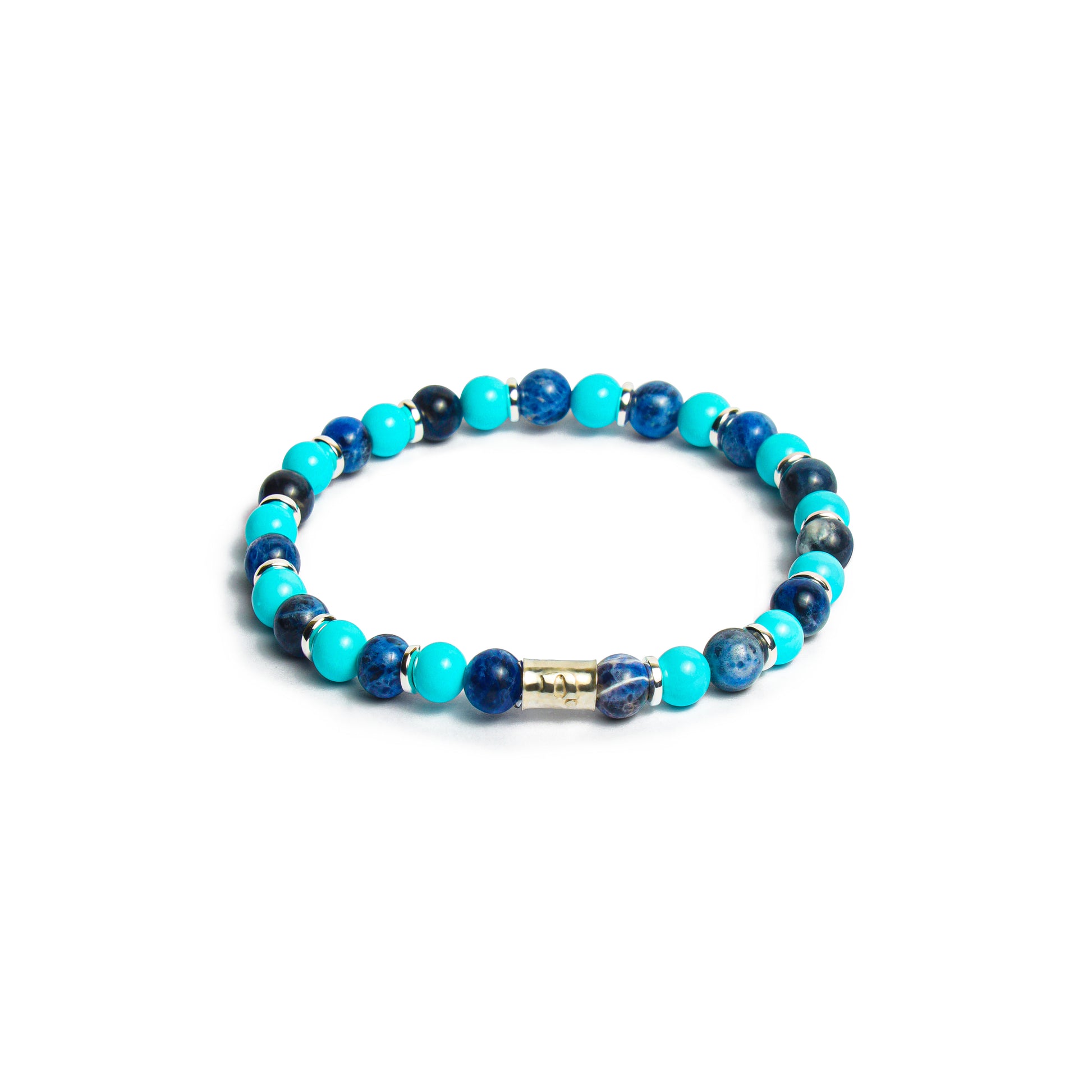 BRACCIALE ELASTICO CON ELEMENTI DI SODALITE, PASTA DI TURCHESE AZZURRA DA 6 MM E ARGENTO 925.